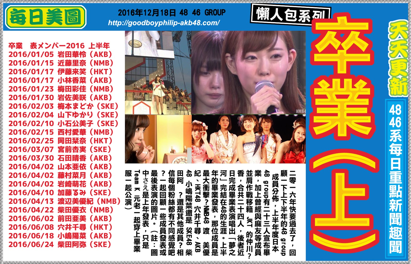 AKB48 每日新聞 18/12 2016上半年 AKB48 SKE48 NMB48 HKT48 NGT48 卒業發表成員。